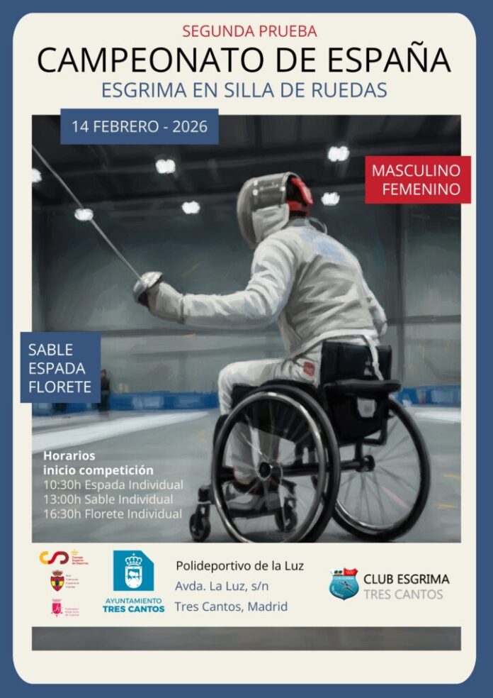 El próximo sábado 14 de febrero se celebrará en la Sala de Esgrima de Tres Cantos la 2ª Prueba Nacional de Ranking del Campeonato de España Absoluto Mixto de Esgrima en Silla de Ruedas, en las modalidades de Espada, Florete y Sable en horario de 10:30 h a 17:30 h.