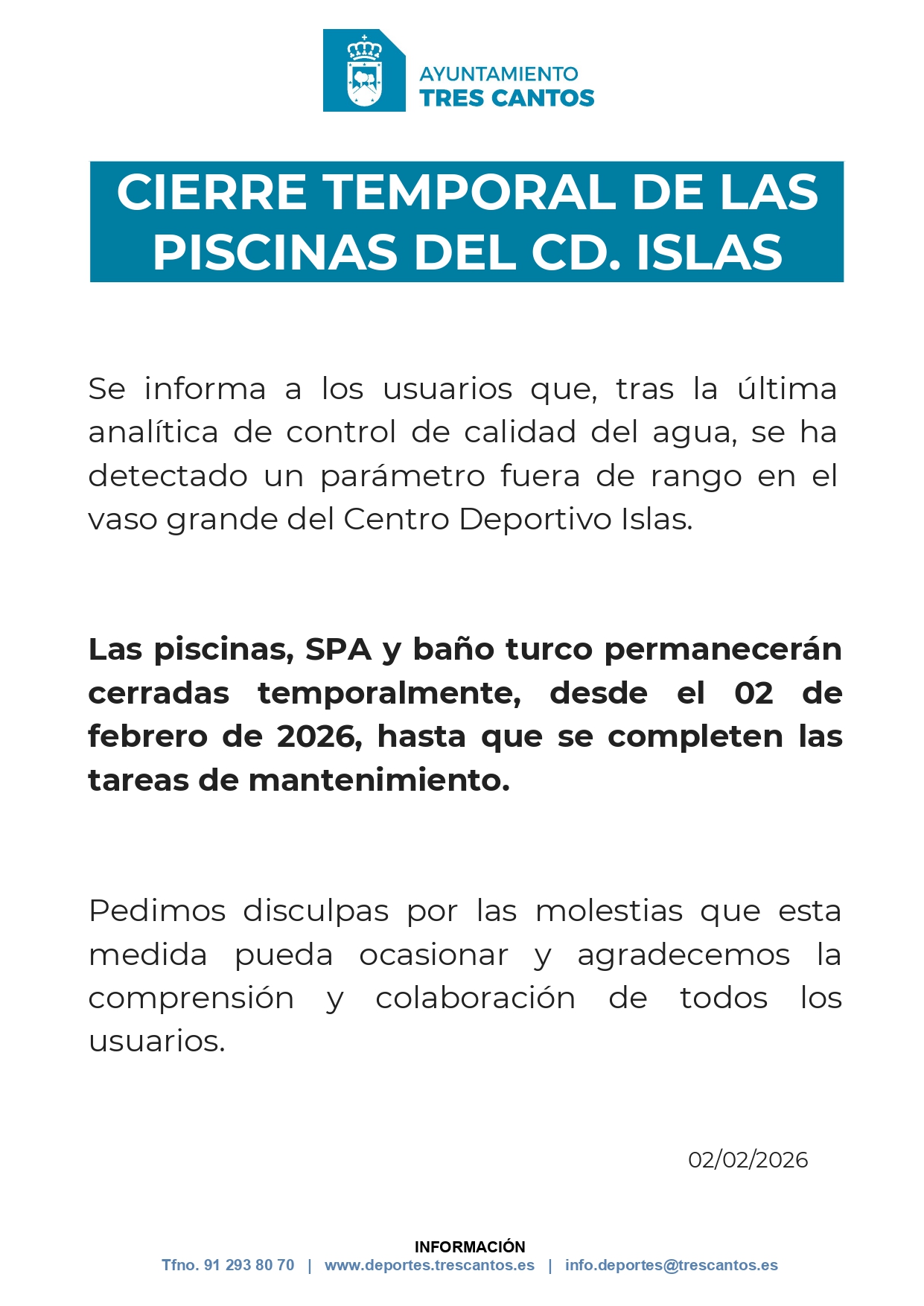 Cierre temporal de las piscinas del Centro Deportivo Islas