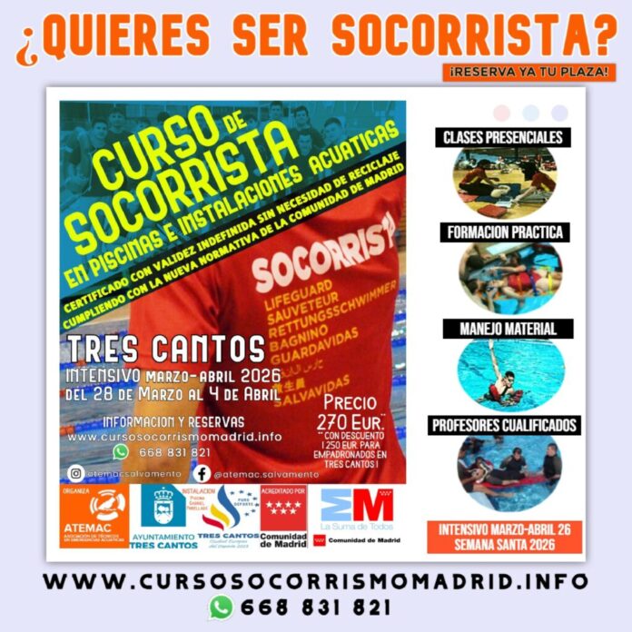 El Ayuntamiento de Tres Cantos y la Asociación de Técnicos en Emergencias Acuáticas (ATEMAC) ponen en marcha un nuevo Curso de Socorrista en piscinas e instalaciones acuáticas para los vecinos de Tres Cantos, del 28 de marzo al 4 de abril.