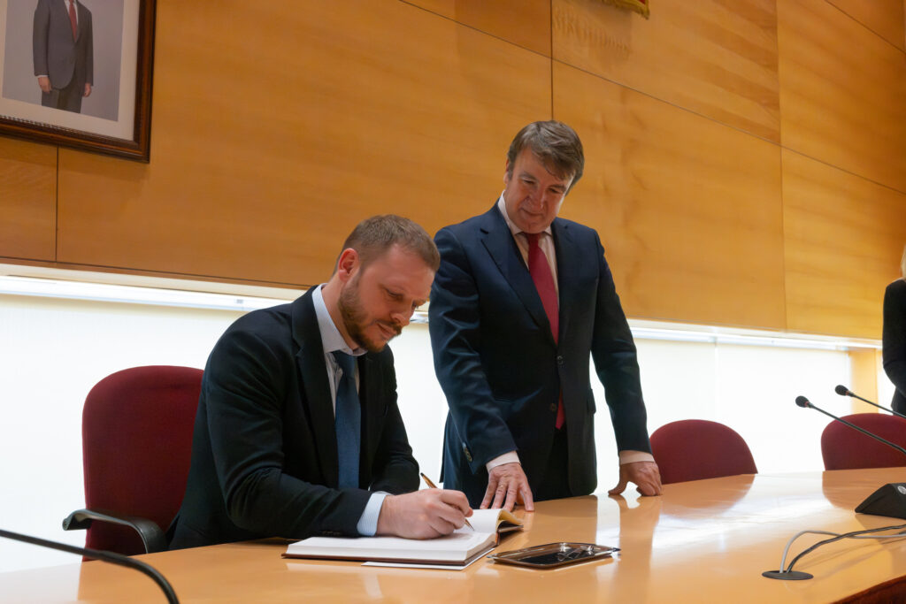 Tras este recibimiento, el equipo de Gobierno municipal y el vicealcalde ucraniano, acompañado por otros integrantes de dicha delegación, han tenido la oportunidad de realizar una visita por los espacios más emblemáticos del Ayuntamiento. Así, en el Salón de Plenos, Belovrov ha dejado su rúbrica en el Libro de Honor del Ayuntamiento, antes de proceder a la firma del convenio de colaboración entre Tres Cantos y Jersón.