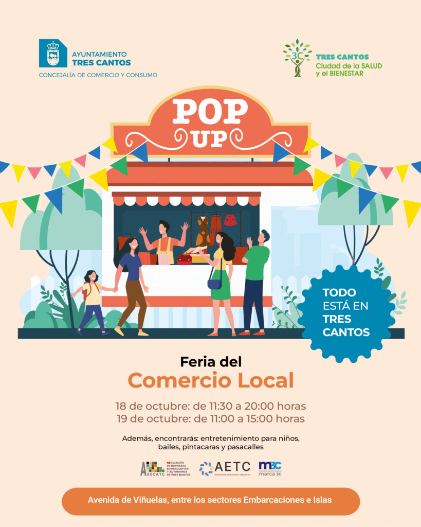 El Ayuntamiento de Tres Cantos, a través de la Concejalía de Comercio y Consumo, organiza la Feria ‘Pop Up’ de comercio local. La Avenida de Viñuelas será el escenario de esta convocatoria, que tendrá lugar este sábado 18, de 11:30 a 20:00 horas, y el domingo 19, de 11:00 a 15:00 horas. Una iniciativa que busca promover el comercio de proximidad y ofrecer a los vecinos una experiencia de compra diferente, cercana y festiva.