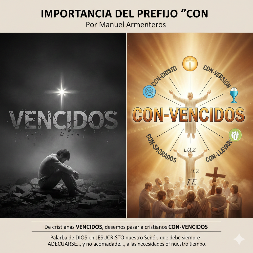 De cristianos VENCIDOS, debemos pasar a cristianos CON-VENCIDOS. A través de un “trato continuo“, CON-CRISTO que nos mueve a una CON-VERSIÓN permanente y mantenida; vista como CON-SAGRADOS, como lo somos por el Bautismo que nos moviliza a un CON-VIVIR con nuestro prójimo (cercano o lejano)…, CON-LLEVANDO no solo la Cruz del sufrimiento, sino mostrando la LUZ necesaria para resolver o tratar con alegría, los grandes problemas de nuestro tiempo. Ayudados por la FE que nos mantiene fieles a su Palabra, a su Evangelio. Palabra de DIOS en JESUCRISTO nuestro Señor, que debe siempre ADECUARSE… y no acomodarse…, a las necesidades de nuestro tiempo.
