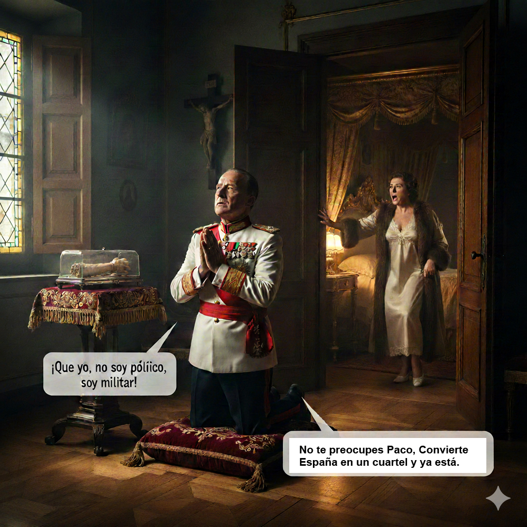 Estando en sentida oración D. Francisco Franco…, su esposa Dña. Carmen, oyó desde la alcoba matrimonial donde se encontraba, unos tímidos gemidos que procedían de esa próxima estancia…, y como iban en aumento dichos gemidos…, su esposa se alarmó y gritó: ¡que pasa Paco!… Y, pasados unos breves segundos, escucho su voz, algo enfadada, y con evidente sentido de queja, exclamaba: ¡Que yo, no soy político, soy militar!
