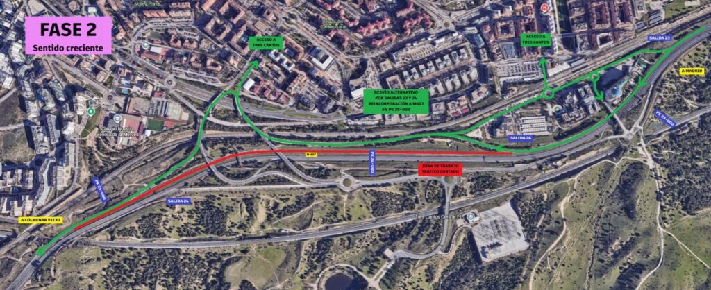 Durante la noche del lunes 20, entre las 22:00 y las 05:30, la M‑607 permanecerá cortada por completo debido a los trabajos de asfaltado de la capa intermedia en el tramo comprendido entre los puntos kilométricos 25+500 y 26+900, en sentido creciente. Se ha establecido un itinerario alternativo por la salida 25 con reincorporación a la M-607 por la salida 26.