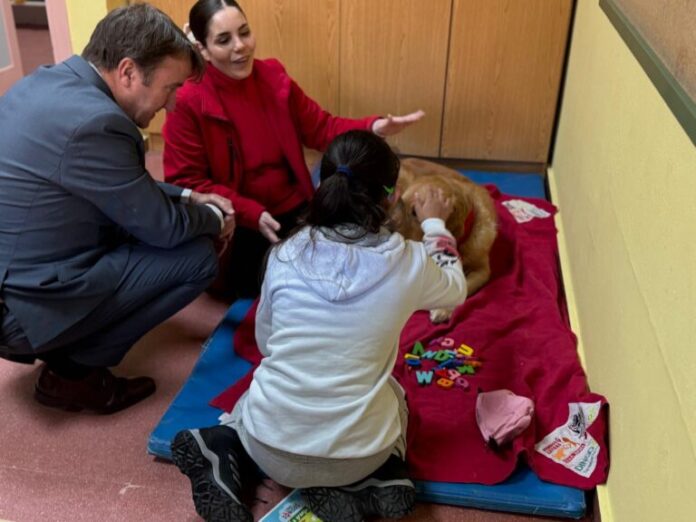 El Ayuntamiento de Tres Cantos ha vuelto a mostrar su apoyo al programa de acompañamiento lector “Perros y Letras”, con una nueva visita del alcalde, Jesús Moreno, y la concejal de Educación, Marisa Peña, a una de las sesiones que se desarrollan con el alumnado de las dos aulas de educación especial integradas en el colegio Antonio Osuna. Durante la sesión estuvieron acompañados por la responsable en España del proyecto Perros y Letras, Elena Domínguez.