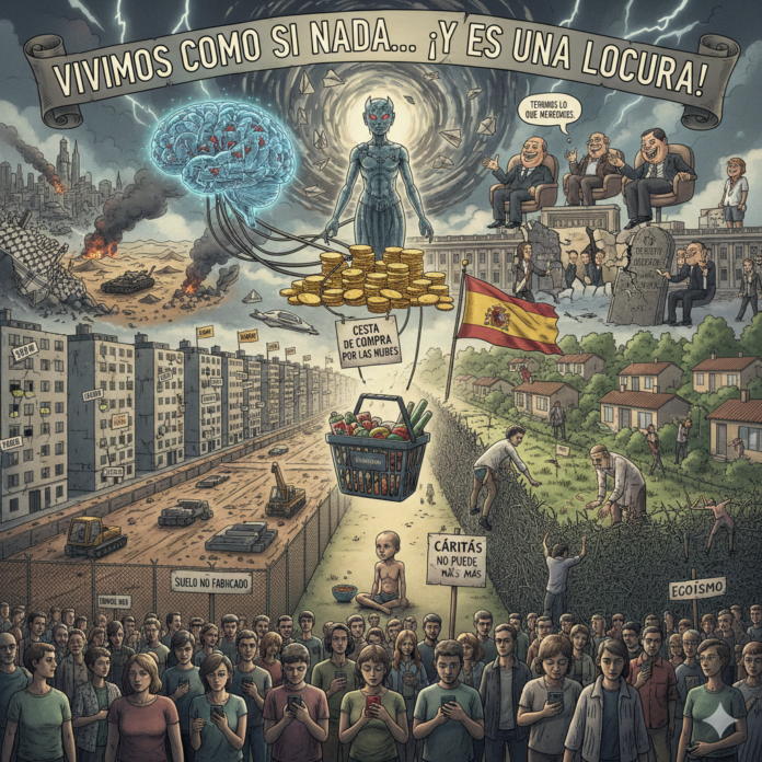 Vivimos y estamos viviendo como si nada y es una locura. Es curioso, hace años y no tantos, la gente se hartaba de manipulaciones y cuando se hartaba, protestaba. Y normalmente era en la calle, ahora parece que está todo el mundo conforme porque se protesta muy poco, pero para mí, no tienen sentido la mayoría de las cosas que se hacen. Estamos en el siglo XXI, en donde, como he dicho otras veces, tenemos un ordenador en la mano y lo sabemos manejar todos, y al mismo tiempo, hay guerras en Ucrania, en Palestina, en Siria y Dios sabe. Cómo es posible, que los seres humanos civilizados que tienen de todo, hasta coches que vuelan y ordenadores que piensan, utilicen la tecnología para matarse unos a otros. Pues, hasta parece que la Inteligencia Artificial no es tan cruel ni miserable como la de altas prestaciones humanas.