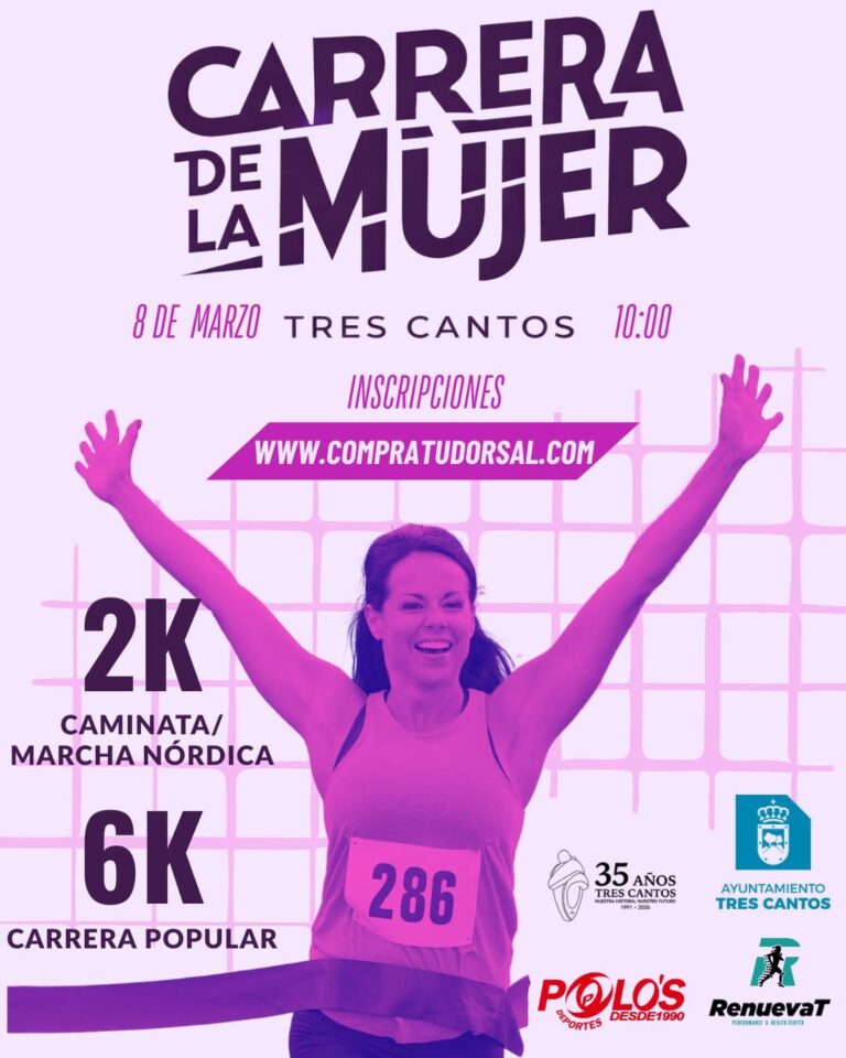 El 8 de marzo, Día Internacional de las Mujeres, tendrá lugar la Carrera de la Mujer Tres Cantos 2026, con un recorrido de 6 km de carrera y 2 km de caminata.