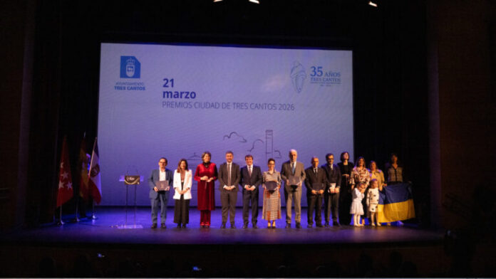 Por último, de manera especial, el Ayuntamiento concedió la Medalla de la Ciudad al Pueblo de Ucrania, en reconocimiento a su defensa de la libertad y de los valores democráticos, así como a su resiliencia y capacidad de superación. Representantes de dicho pueblo —vecinos de Tres Cantos— subieron al escenario para recibir su correspondiente distinción.