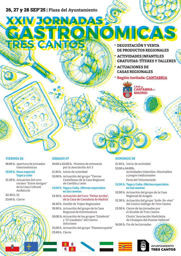 Tres Cantos celebra este fin de semana la XXIV edición de las Jornadas Gastronómicas. Un encuentro organizado desde la Concejalía de Participación Ciudadana, que tendrá lugar en la Plaza del Ayuntamiento y que contará con la presencia de diferentes casas regionales, degustaciones, venta de productos autóctonos e interesantes actividades de diferente temática y dirigidas a todos los públicos.